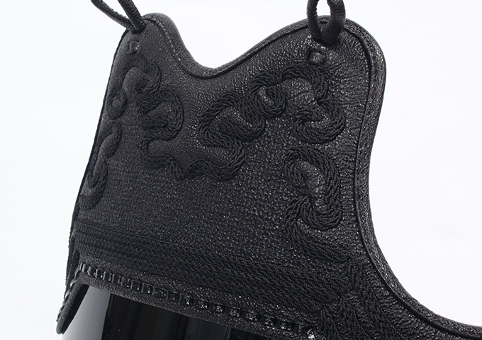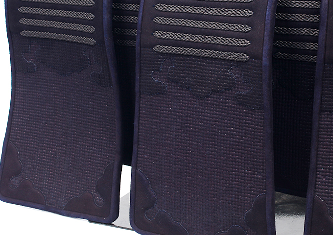 剣道防具の美しさを大きく左右する革飾り。丁寧に加工が施された紺鹿革は美しく鋭い打突から身を守る剣道防具としての耐久性も兼ね備えます。本特別企画カタログに掲載されている剣道防具には厳選された紺鹿革を使用しています。