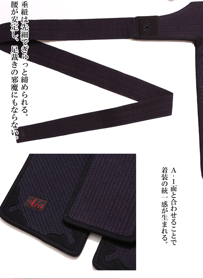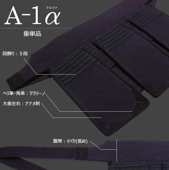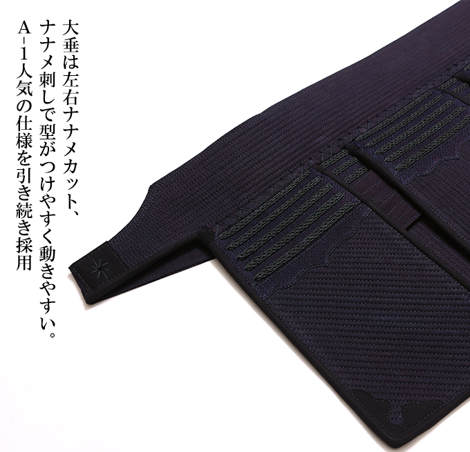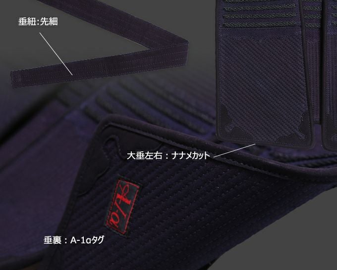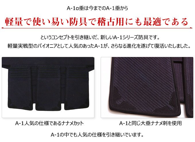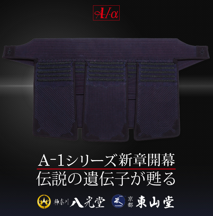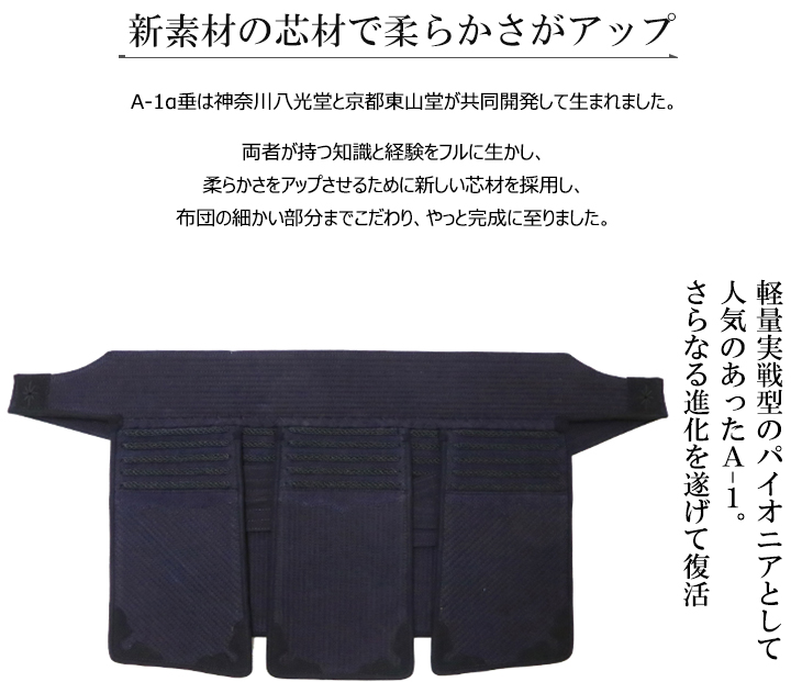 伝説の遺伝子が甦る 軽量実戦型のパイオニアとして人気のあったA-1。 さらなる進化を遂げて復活。 大垂小垂はナナメカット、ナナメ刺と人気の仕様を採用いたしました。 芯材はさらに柔らかさを出すために新しい物を使い、 顎の形や布団の細かい部分まで神奈川八光堂と共同開発した A-1シリーズの新しい防具です。