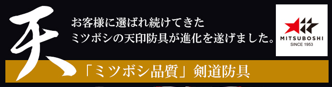 お客様に選ばれ続けてきたミツボシの天印防具が進化を遂げました。 それは自然なつけ心地を実現させた独自製法輪や、布団の刺し幅を細かくすることで高質純毛の素材を最大限に引き出すなど、妥協を許さないこだわりを随所に詰め込んだ「ミツボシ品質」剣道防具です。 しなやかな刺で仕上げることで生まれる身体と防具の一体感はストレスを全く感じさせない絶妙なバランスで大変扱いやすく、また紺鹿革と藍染め生地が色落ちする事で美しい経年変化が愉しめるので、あなたの相棒として長年愛される防具になることでしょう。