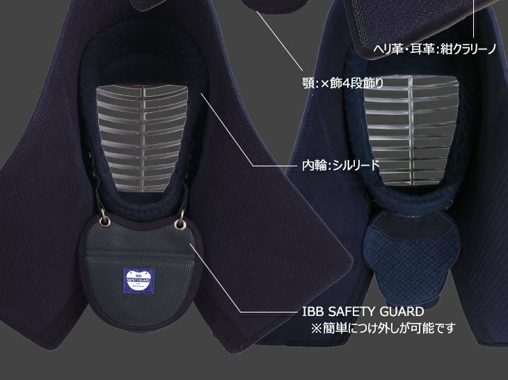 | IBBセーフティガードについて | IBBセーフティガード(=ISG)標準装備の剣道防具につきまして、ISGは喉を防御するアタッチメント式可動可変プロテクターです。こちらは使用場面に合わせて自由に取り付け、取り外し可能が可能です。くわしくはこちら |