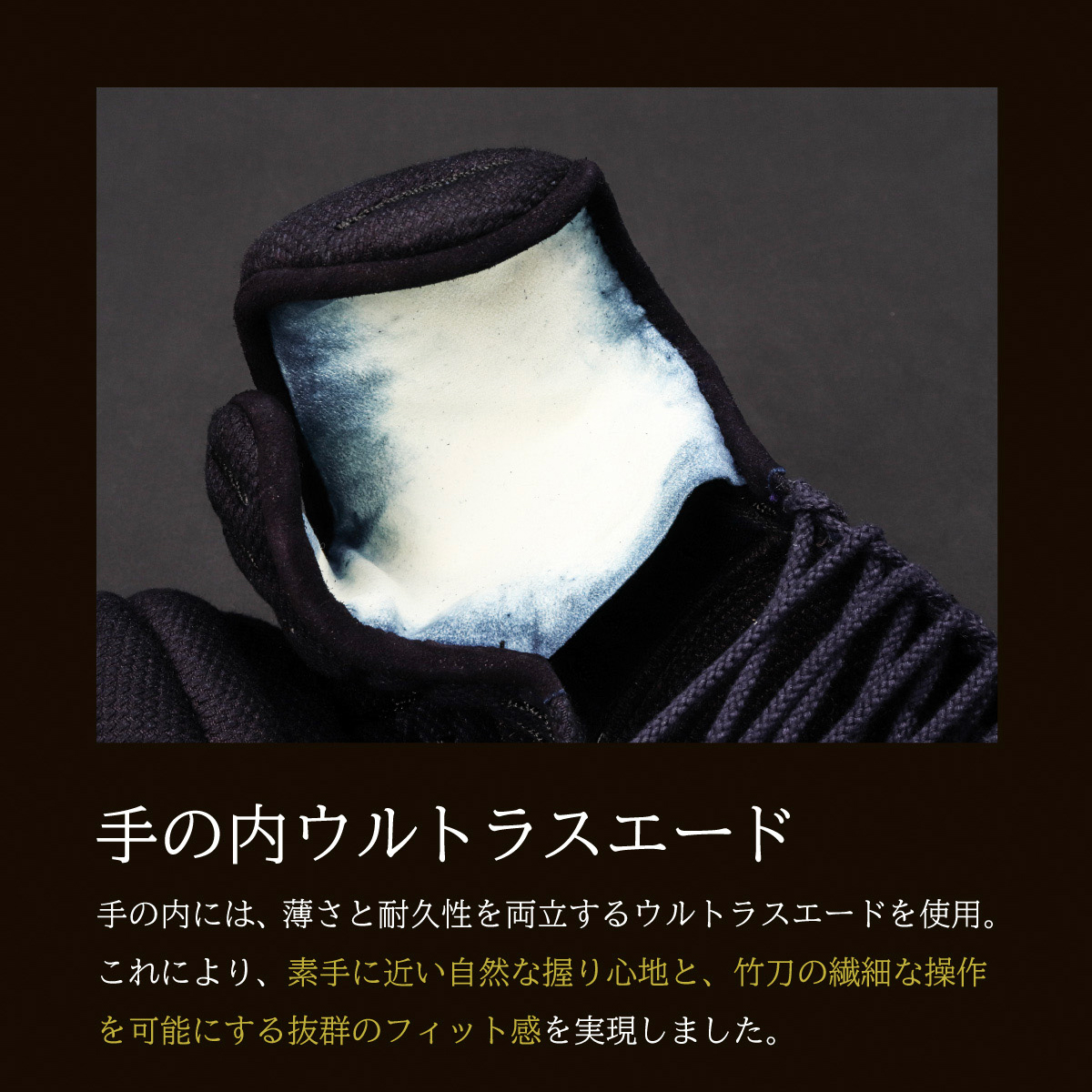 手の内には、薄さと耐久性を両立するウルトラスエードを使用。これにより、素手に近い自然な握り心地と、竹刀の繊細な操作を可能にする抜群のフィット感を実現しました。