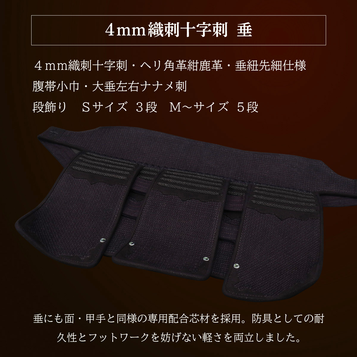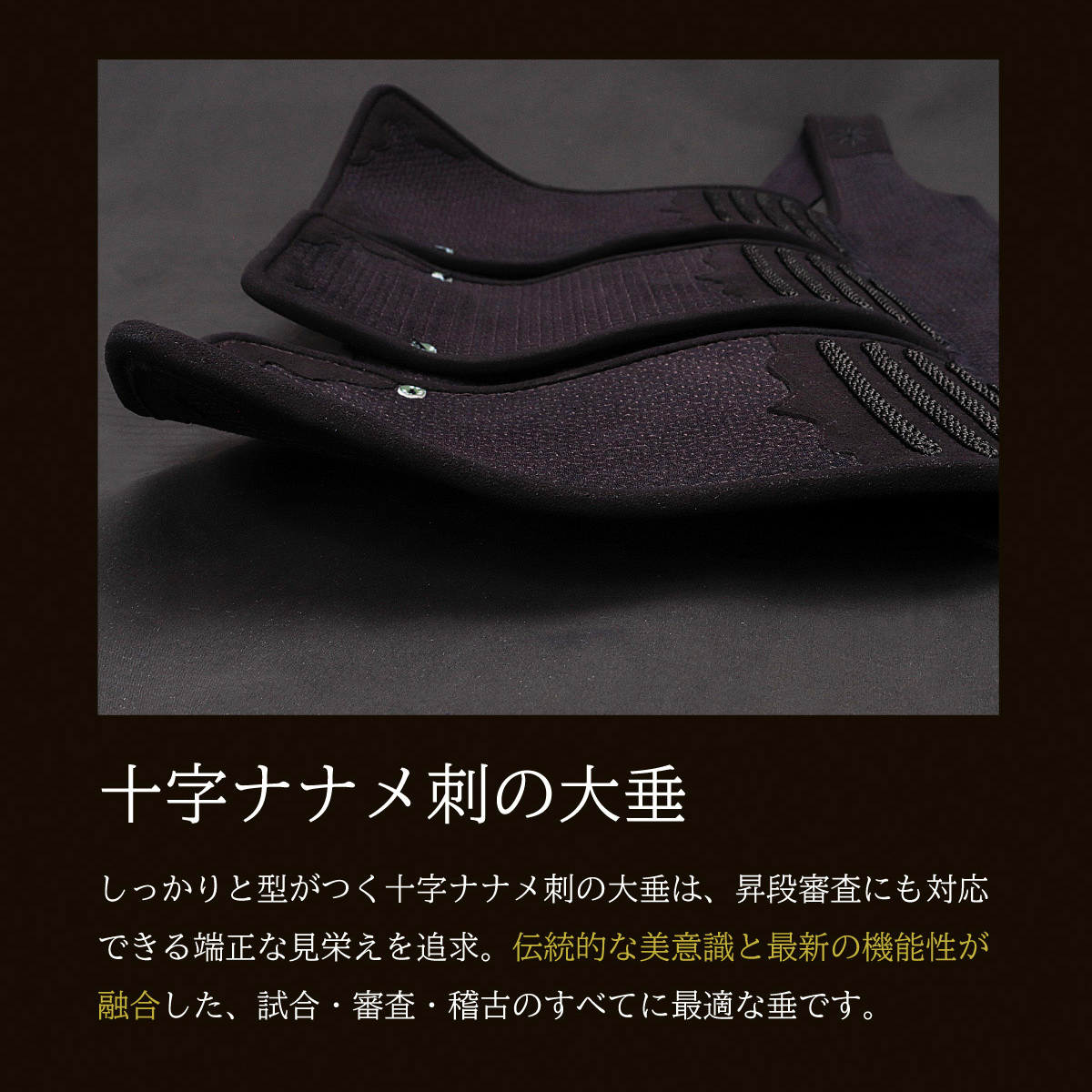 しっかりと型がつく十字ナナメ刺の大垂は、昇段審査にも対応できる端正な見栄えを追求。伝統的な美意識と最新の機能性が融合した、試合・審査・稽古のすべてに最適な垂です。