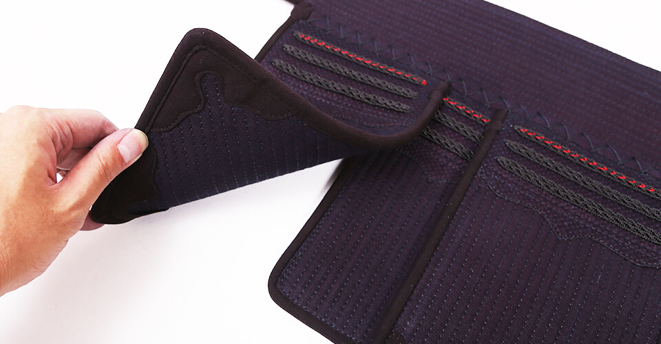 A-1シリーズ待望の少年用 お子さまが剣道をやめてしまう原因の一つが打突による痛み。 ただ、衝撃吸収に偏ってしまうと動きづらく稽古に支障が出てしまいます。 厚い必要があるところは厚く、薄くあるべきところは薄くし 打突による痛みを和らげ、動きやすい防具となりました。 垂帯の高さをやや低くすることで腹部の圧迫を抑え、動きやすくなっております。 また、左右の大垂をナナメカット、ナナメ刺にすることでお子さまでも先生方のように 末広がりの型をつけやすくなっております。