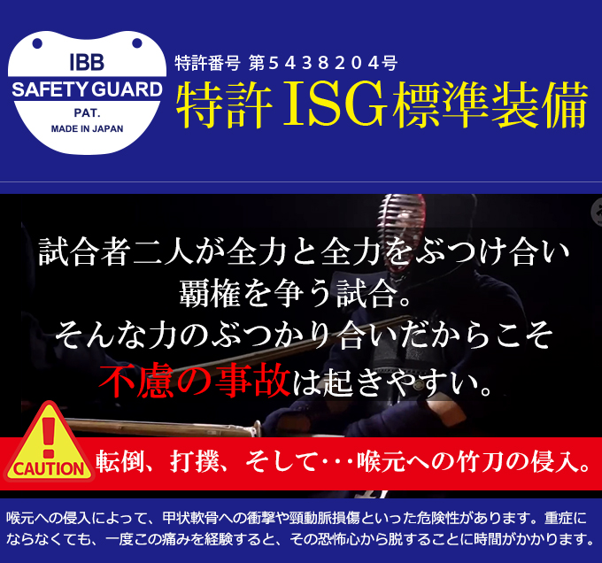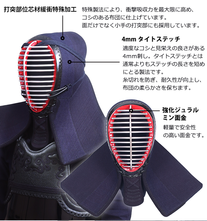面:強化ジュラルミン、打突部位芯材緩衝特殊加工、内輪抗菌素材、ISG標準装備、四段飾