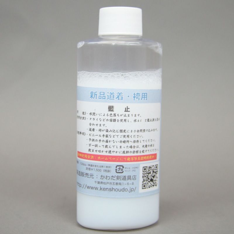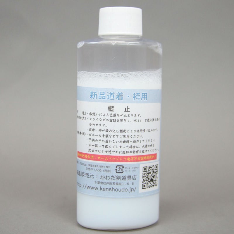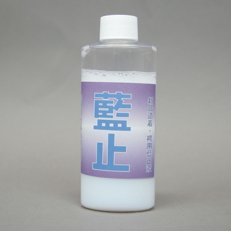 高級品道衣・袴用藍止液です。 折角の正藍染の高級道衣・袴も藍はどうしても色落ちをしていきます。 しかし、こちらの商品でお手入れを最初にしていただきますと 水洗い後の藍の色落ちが9割程度止まります! 手入れの仕方は商品に解説が載っておりますが ぬるま湯を約6リットルに藍止液を一本加えていただきまして 道衣・袴を浸して良く揉み込んでいただき約三十分置いておいてください。 その後、約一週間ほど乾かしておいてください。