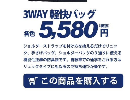 他の画像を見る リュック、ショルダー、手提げの3WAY [新入生応援特価]3WAY軽快バッグ【防具袋】 定価 ¥ 8,778 のところ 当店特別価格 ¥ 6,380 税込 詳細を見る お気に入りに登録する 4.33 (3)