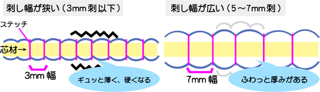 ミシン縫いの刺し幅が狭くなると、中の芯材が圧縮されて