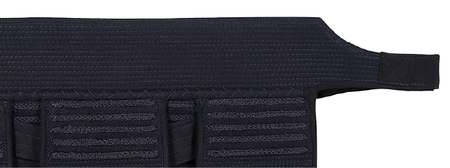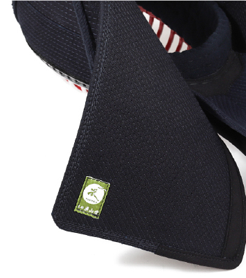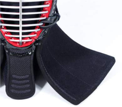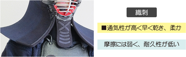 竹刀の上げ下ろし時に腕とこすれる面垂の前の部分や、「突き」を受ける突き垂には、汗や摩擦に強い人工皮革(クラリーノ革)を使用しています。