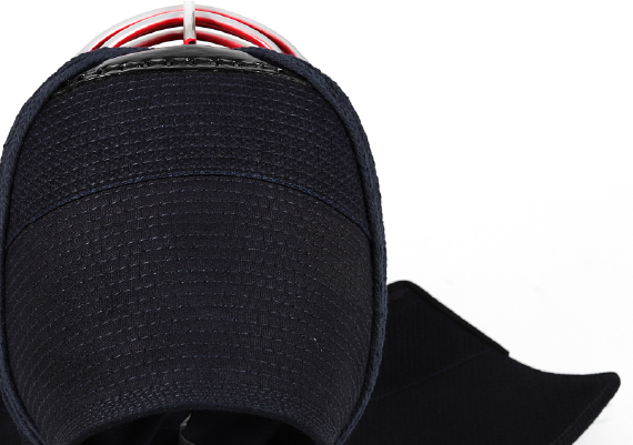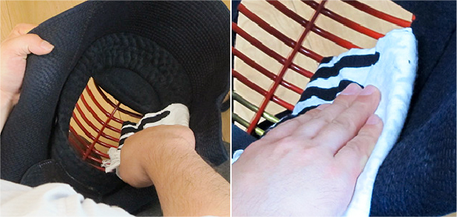 肩に当たる面垂は「ナナメ刺」という竹刀を振りかぶった際に面布団が折れ曲がる方向に逆らわないようステッチを入れる技法で縫製しています。この「ナナメ刺」によって竹刀の振り上げ、振り下ろしをスムーズに行うことができます。